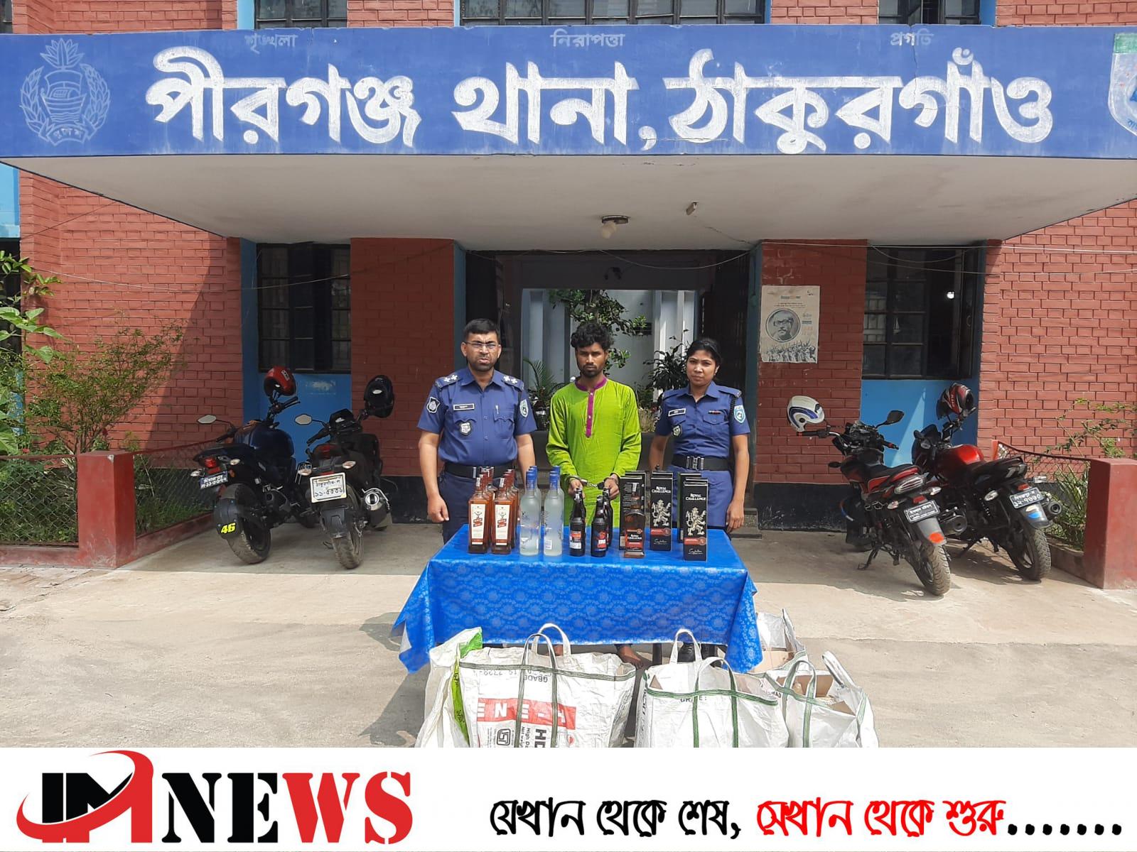 পীরগঞ্জ থানার (এস আই) মকুল কুমার সেন জানান ,মঙ্গলবার দিবাগত রাতে গোপন সংবাদের ভিত্তিতে পুলিশের একটি চৌকস দল বিশেষ অভিযান পরিচালনা করে উপজেলার রনশিয়া চন্দ্রা এলাকা থেকে আকরাম হোসেন কে ৪৫ বোতল বিদেশী নিষিদ্ধ মদ সহ আটক করে।