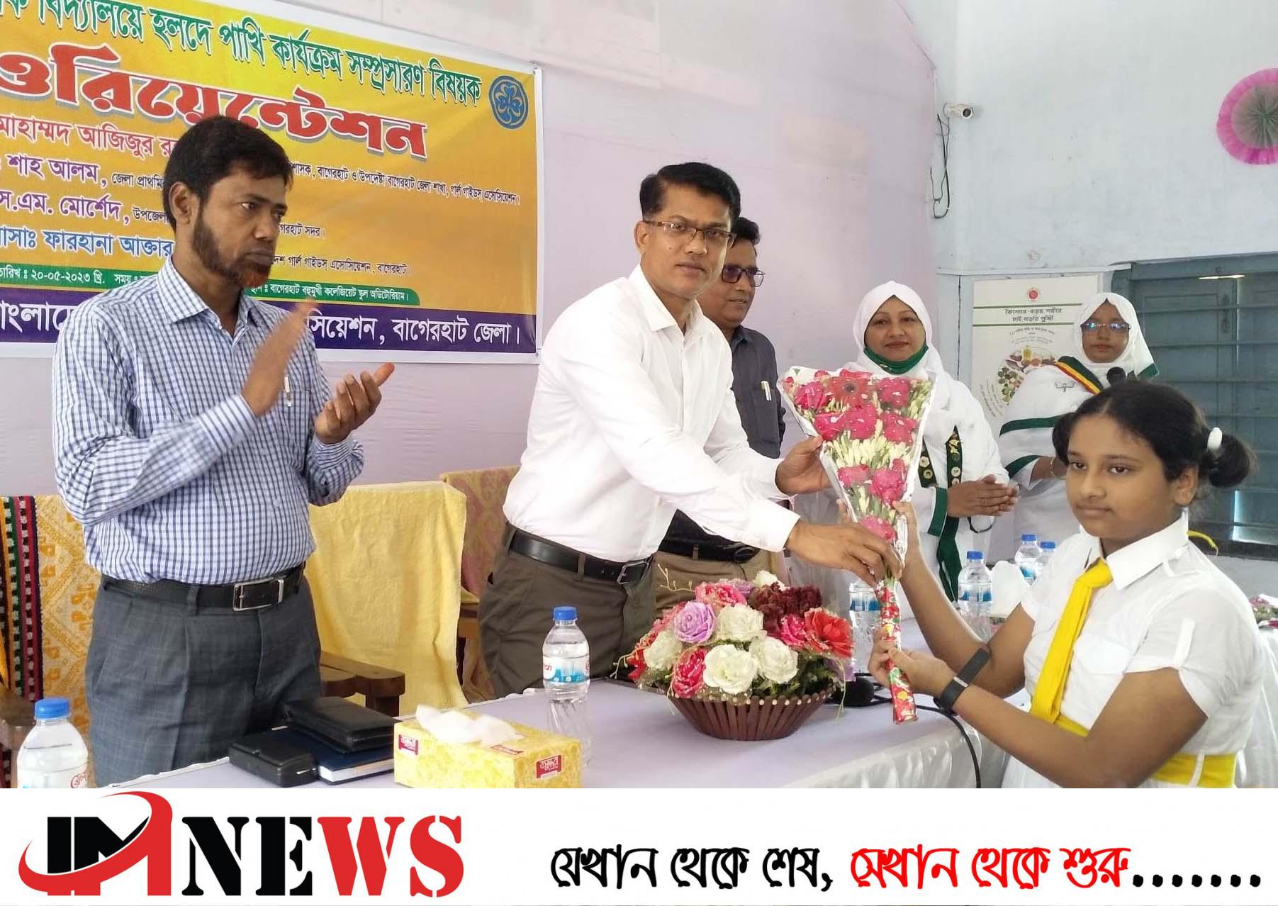 বাগেরহাটে প্রাথমিক বিদ্যালয়ে হলদে পাখি কার্যক্রম সম্প্রসারণের বিষয়ক ওরিয়েন্টেশন এবং ডেঙ্গু, পুষ্টি ও স্বাস্থ্য সচেতনতা বিষয়ক প্রশিক্ষন অনুষ্ঠিত হয়েছে। বাংলাদেশ গার্ল গাইডস এ্যাসোসিয়েশন বাগেরহাট জেলা শাখার আয়োজনে শনিবার (২০ মে) সকালে বহুমুখী কলেজিয়েট স্কুল অডিটোরিয়ামে অনুষ্ঠিত ওরিয়েন্টেশনে প্রধান অতিথি ছিলেন জেলা প্রশাসক মোহাম্মদ আজিজুর রহমান।
