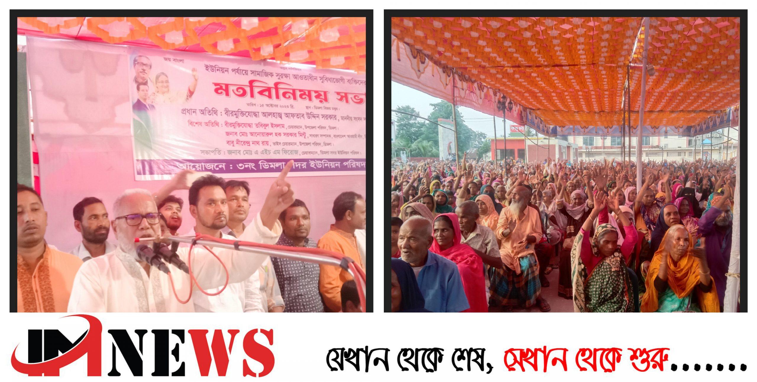 ।নীলফামারীর ডিমলায় ইউনিয়ন পর্যায়ে সামাজিক সুরক্ষা আওতাধীন সুবিধাভোগী ব্যক্তিদের নিয়ে এক বিশাল মত বিনিময় সভা অনুষ্ঠিত হয়েছে।রোববার(১৫ অক্টোবর)বিকেল থেকে সন্ধ্যা পর্যন্ত ডিমলা ৩-নং সদর ইউনিয়ন পরিষদের আয়োজনে সদরের প্রাণকেন্দ্র বিজয় চত্ত্বরে এ সভা অনুষ্ঠিত হয়।এতে প্রধান অতিথি হিসেবে উপস্থিত ছিলেন, নীলফামারী-১(ডোমার-ডিমলা)আসনের সংসদ সদস্য বীর মুক্তিযোদ্ধা আলহাজ্ব আফতাব উদ্দিন সরকার।বিশেষ অতিথি হিসেবে উপস্থিত ছিলেন, উপজেলা আওয়ামী লীগের সাধারণ সম্পাদক আনোয়ারুল হক সরকার মিন্টু, উপজেলা ভাইস চেয়ারম্যান বাবু নিরেন্দ্রনাথ রায়।ডিমলা সদর ইউনিয়ন পরিষদ চেয়ারম্যান এ.এইচ.এম ফিরোজ সরকারের সভাপতিত্বে ও উপজেলা ছাত্রলীগের আহ্বায়ক আবু সায়েম সরকারের সঞ্চালনায় এ সময় বক্তব্য দেন, ডিমলা উচ্চ বিদ্যালয়ের প্রধান শিক্ষক ও উপজেলা আওয়ামী লীগের যুগ্ন‌ সাধারন সম্পাদক লুৎফর রহমান,বালাপাড়া ইউনিয়নের সাবেক চেয়ারম্যান ও উপজেলা আওয়ামী লীগের দপ্তর সম্পাদক জহুরুল হক ভূঁইয়া,উপজেলা যুবলীগের যুগ্ন সাধারণ সম্পাদক ও জেলা পরিষদের সদস্য ফেরদৌস পারভেজ,সদর ইউনিয়ন পরিষদের ৬ নম্বর ওয়ার্ডের ইউপি সদস্য সামছুল ইসলাম,১ নম্বর ওয়ার্ডের ইউপি সদস্য হাসানুর রহমান,৭,৮,৯ নম্বর ওয়ার্ডের সংরক্ষিত নারী সদস্য আফরোজা পারভিন ও ৯ নম্বর ওয়ার্ডের ইউপি সদস্য বাদল ইসলাম স্বপন প্রমুখ।সভায় প্রধান অতিথি বর্তমান সরকারের বিভিন্ন উন্নয়নের কথা তুলে ধরে কে এমপি হলো না হলো সেদিকে না দেখে পুনরায় আওয়ামী লীগ সরকারকে নির্বাচিত করতে নৌকা মার্কায় ভোট চান। মত বিনিময় সভায় ৬  হাজারের অধিক সুবিধাভোগী ছাড়াও ইউপি সদস্য,সংরক্ষিত নারী সদস্যসহ বিভিন্ন শ্রেণী-পেশার মানুষজন উপস্থিত ছিলেন।