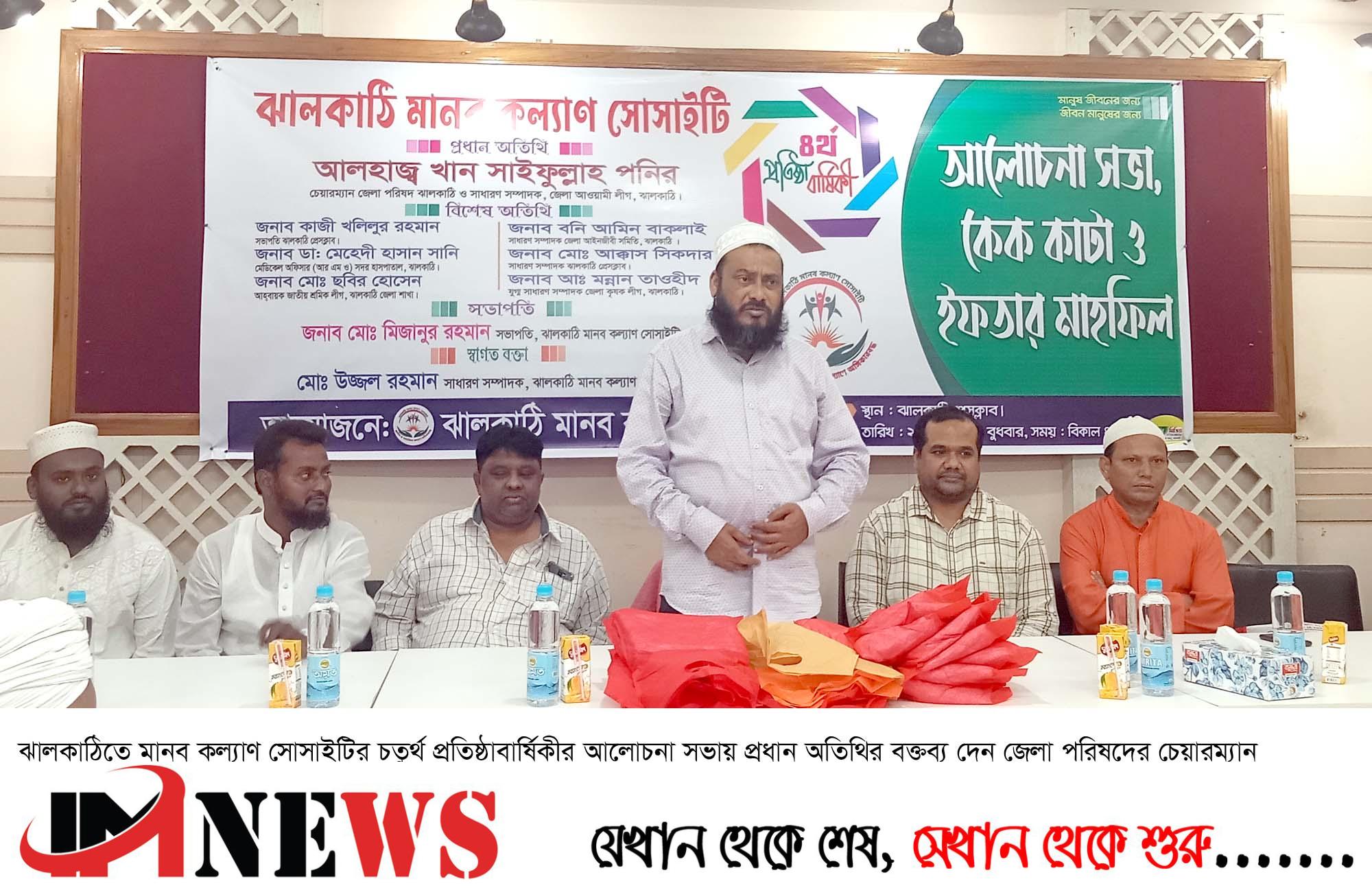 ঝালকাঠিতে স্বেচ্ছাসেবী সংগঠন মানব কল্যাণ সোসাইটির চতুর্থ প্রতিষ্ঠাবার্ষিকী উপলক্ষে আলোচনা সভা ও ইফতার মাহফিল অনুষ্ঠিত হয়েছে। বুধবার বিকেলে ঝালকাঠি প্রেসক্লাব মিলনায়তনে এ অনুষ্ঠানের আয়োজন করে সংগঠনটি। এতে প্রধান অতিথি ছিলেন জেলা পরিষদের চেয়ারম্যান ও জেলা আওয়ামী লীগের সাধারণ সম্পাদক অ্যাডভোকেট খান সাইফুল্লাহ পনির। বিশেষ অতিথি ছিলেন ঝালকাঠি প্রেসক্লাবরে সভাপতি কাজী খলিলুর রহমান, সাধারণ সম্পাদক অ্যাডভোকেট আক্কাস সিকদার, জেলা আইনজীবী সমিতির সাধারণ সম্পাদক বনি আমিন বাকলাই, ঝালকাঠি সদর হাসপাতালের মেডিকেল অফিসার ডাঃ মেহেদী হাসান সানি, জেলা শ্রমিক লীগের আহŸায়ক মো. ছবির হোসেন, জেলা কৃষক লীগের যুগ্ন সাধারণ সম্পাদক আঃ মন্নান তাওহীদ। বক্তব্য দেন সংগঠনের সভাপতি মিজানুর রহমান ও সাধারণ সম্পাদক মোঃ উজ্জল রহমান। পরে ছবির হোসেনের জন্মদিন উপলক্ষে কেক কাটা হয়। অনুষ্ঠানে এতিম শিশুসহ বিভিন্ন শ্রেণি পেশার মানুষ অংশ গ্রহণ করে। ২০২০ সালে করোনাকালীন সময়ে শহরের কিছু তরুণ স্বেচ্ছাসেবক করোনা প্রতিরোধসহ সেবামূলক কাজ করার জন্য মানবকল্যাণ সোসাইাট গঠন করেন।