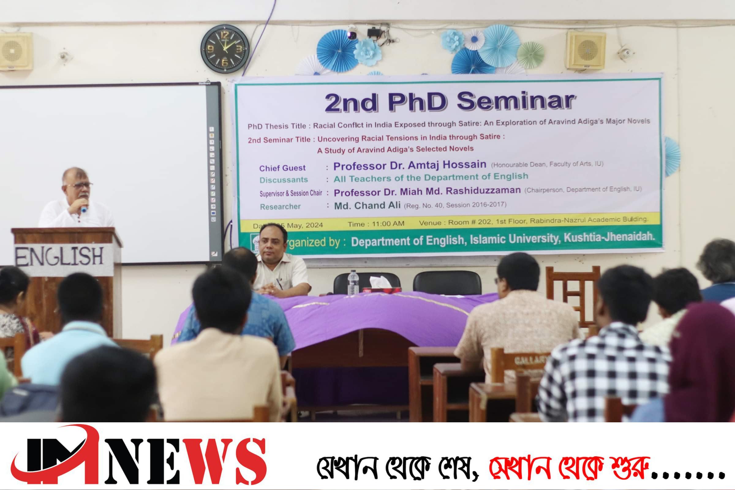 ইসলামী বিশ্ববিদ্যালয়ে (ইবি) ‘রেসিয়াল কনফ্লিক্ট ইন ইন্ডিয়া এক্সপোজড থ্রু স্যাটায়ার: এন এক্সপ্লোরেশন অফ অরবিন্দ আদিগা’স মেজর নোভেলস’ শীর্ষক গবেষণা শিরোনামে পিএইচডি সেমিনার অনুষ্ঠিত হয়েছে।