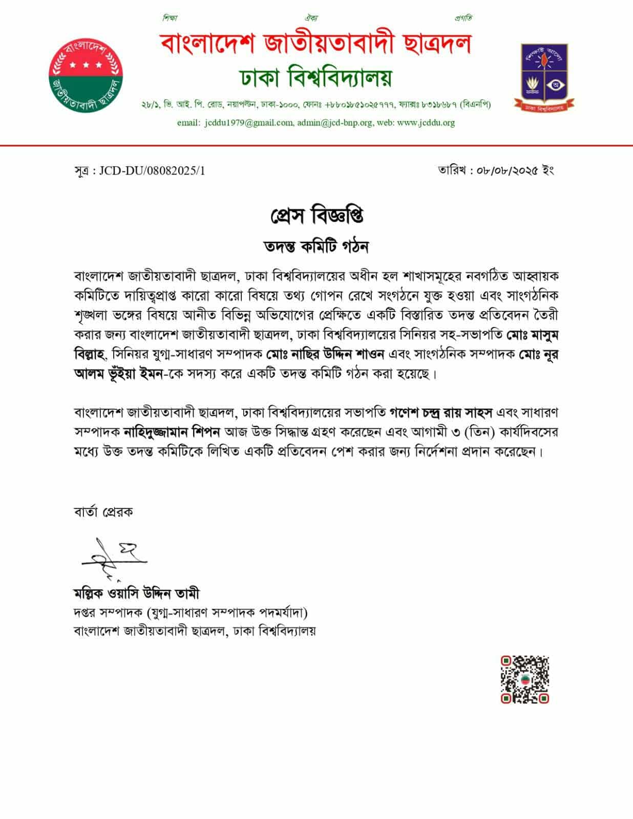 এই প্রেক্ষাপটে ছাত্রদলের ঢাকা বিশ্ববিদ্যালয় শাখা একটি তদন্ত কমিটি গঠন করেছে। তিন সদস্যের এ কমিটিতে রয়েছেন সংগঠনের সিনিয়র সহ-সভাপতি মো. মাসুম বিল্লাহ, সিনিয়র যুগ্ম-সাধারণ সম্পাদক মো. নাছির উদ্দিন শাওন এবং সাংগঠনিক সম্পাদক মো. নূর আলম ভূঁইয়া ইমন। কমিটিকে তিন কার্যদিবসের মধ্যে একটি লিখিত প্রতিবেদন জমা দিতে নির্দেশনা দেয়া হয়েছে।