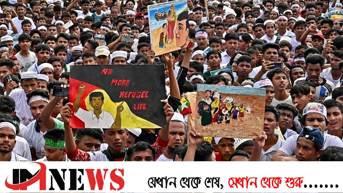 সমাবেশে হাতে প্ল্যাকার্ড-ব্যানার হাতে নিয়ে রোহিঙ্গারা জানান, তারা নিজ দেশে ফিরতে চান।