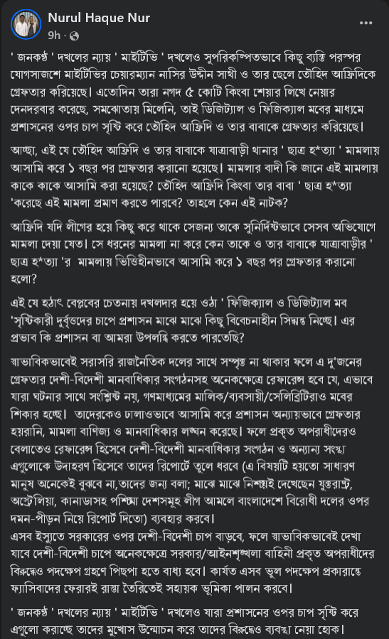স্ট্যাটাসে তিনি লেখেন, ‘জনকণ্ঠ’ দখলের ন্যায় ‘মাই টিভি’ দখলেও সুপরিকল্পিতভাবে কিছু ব্যক্তি পরস্পর যোগসাজশে মাই টিভির চেয়ারম্যান নাসির উদ্দীন সাথী ও তার ছেলে তৌহিদ আফ্রিদিকে গ্রেপ্তার করিয়েছে। এতোদিন তারা নগদ ৫ কোটি কিংবা শেয়ার লিখে নেয়ার দেনদরবার করেছে, সমঝোতায় মিলেনি, তাই ডিজিটাল ও ফিজিক্যাল মবের মাধ্যমে প্রশাসনের ওপর চাপ সৃষ্টি করে তৌহিদ আফ্রিদি ও তার বাবাকে গ্রেপ্তার করিয়েছে।