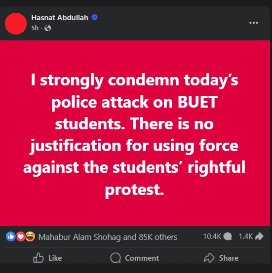 ফেসবুক পোস্টে হাসনাত আবদুল্লাহ বলেন, ‘আমি আজ বুয়েট শিক্ষার্থীদের ওপর পুলিশের হামলার তীব্র নিন্দা জানাই। শিক্ষার্থীদের ন্যায্য আন্দোলনের বিরুদ্ধে বলপ্রয়োগের কোনও যৌক্তিকতা নেই।’