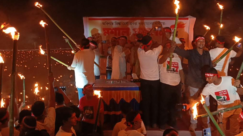 তিস্তা মহাপরিকল্পনার কাজ দ্রুত শুরু করার দাবিতে আবারও উত্তাল হয়ে উঠেছে উত্তরাঞ্চল। ‘জাগো বাহে তিস্তা বাঁচাই’ আন্দোলনের অংশ হিসেবে রংপুর বিভাগের পাঁচটি জেলায় (লালমনিরহাট, রংপুর, নীলফামারী, কুড়িগ্রাম ও গাইবান্ধা) একযোগে ১১টি পয়েন্টে মশাল প্রজ্জ্বলন কর্মসূচি পালন করা হয়েছে।